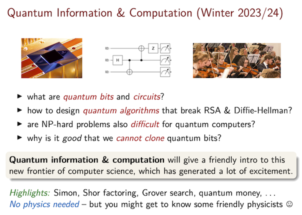 You will learn fundamental concepts, algorithms, and results in quantum information and computation. After successful completion of this course, you will know the theoretical model of quantum information and computation, how to generalize computer science concepts to the quantum setting, how to design and analyze quantum algorithms and protocols for a variety of computational problems, and how to prove complexity theoretic lower bounds. You will be prepared for an advanced course or a BSc project in this area.